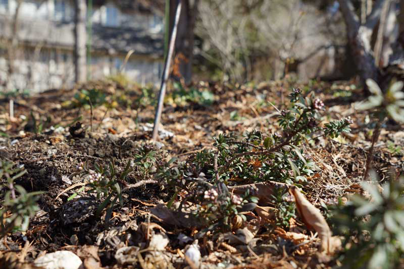 西庭の落葉樹の下、あちこちにクリスマスローズが咲いているが、未だ茎が短く葉は出ていない。