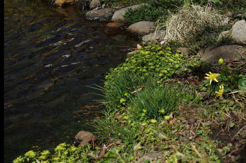 この辺りに自生するトウダイグサ、特に池の端、沢筋がお好きなよう。(噴水池の端) 4/16日