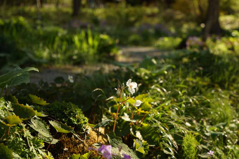 シラユキゲシ、大型の草花に追われてどんどん移動していくシラユキゲシ、踏まれても散策路傍の方が居心地が良いらしい。 5/8日