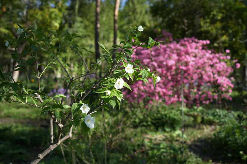 シロヤマブキ、奥はロードデンドロン・春一番。 5/8日