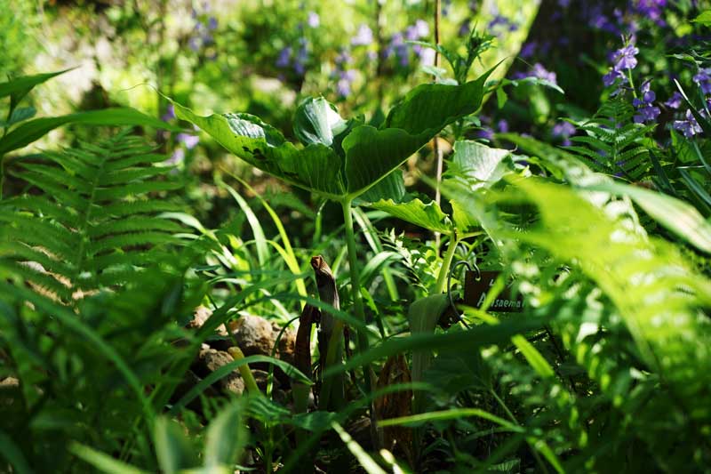 天南星・ムサシアブミが拡げた葉の脇からニュキニョキと茎を伸ばし始めた。 5/16日