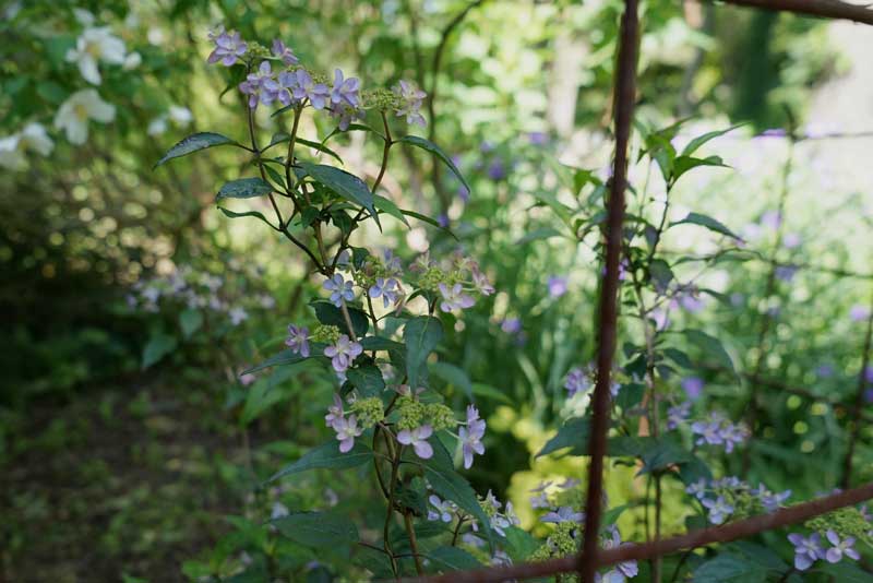 ヤマアジサイ・クロヒメ、木陰で咲くと独特の妖艶さを放つクロヒメ、今年は春先の寒の戻りで枯れ戻しが目立つヤマアジサイ達も花の時期を迎えている。 6/26日