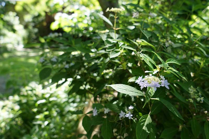 緑陰に咲くコアジサイ、希に白い飾り花を付けることがある。 6/26日