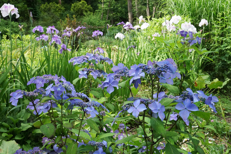 ヤマアジサイ・クロヒメ、梅雨空にはヤマアジサイがよく似合う?花菖蒲たちとお仲間のように咲き競っている。 7/2日