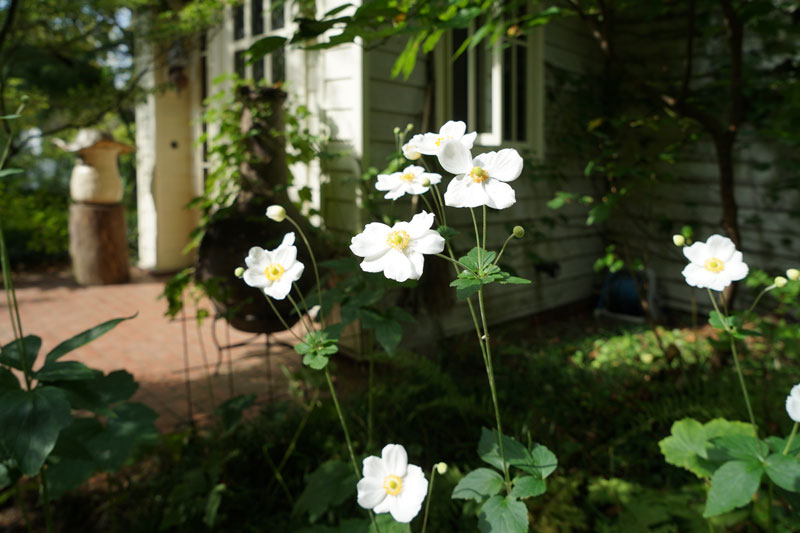 母屋のポーチ脇に咲くシュウメイギク。 9/28日