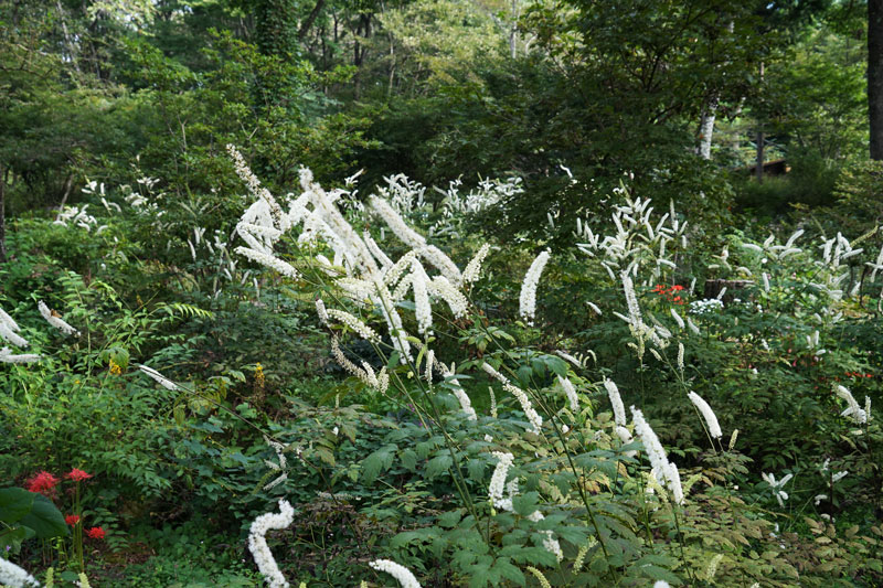 遅れて咲いた彼岸花とサラシナショウマの満開期が重なっている。 9/29日